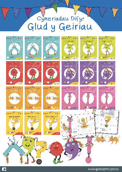 Dewch i gwrdd â saith o Gymeriadau Difyr cyfres. Glud y Geiriau sy’n cyflwyno elfennau atalnodi i ddisgyblion y Cyfnod Sylfaen trwy amryw gerddi a straeon hwyliog. Mae’r 21 llyfr yn y gyfres hon yn cyflwyno saith elfen atalnodi mewn ffordd hylaw i ddarllenwyr ifanc.Meet the seven characters of the Glud y Geiriau series that introduce punctuation elements to pupils in the Foundation Phase through various poems and funny stories.