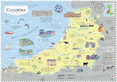 Map hardd o Geredigion gan yr artist dawnus, Valériane Leblond. Dangosir mannau pwysig y sir, cymeriadau enwog lleol a thestun Cymraeg llawn gwybodaeth gan Elin Meek. Poster A3, meddal i’w gyffwrdd sy’n nodi uchafbwyntiau nodedig y sir ac a fydd yn rhodd neu gofrodd perffaith.Beautiful map of Ceredigion by talented artist, Valériane Leblond. Featuring important Ceredigion landmarks, famous local people and highly informative Welsh text by Elin Meek. This A3 soft-to-touch poster highlights the Welsh county and will make an excellent souvenir or gift.