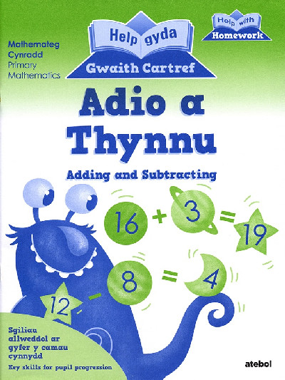 Datblygwyd y llyfr gwaith hwn er mwyn cefnogi dysgwyr gyda gwaith Adio a Thynnu yn y dosbarth, gan anelu at gynorthwyo i adeiladu hyder disgyblion ac atgyfnerthu eu dealltwriaeth o sgiliau allweddol sylfaenol.Developed to support learners in their school work, this Help with Homework workbook relating to Adding and Subtracting will help to build children’s confidence and reinforce their understanding of basic key skills.