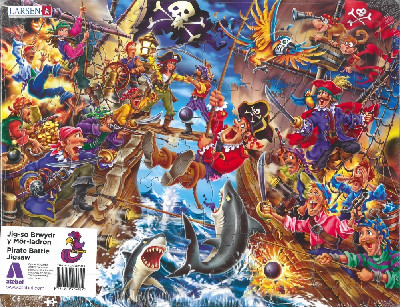 Jigso lliwgar a bywiog gan Atebol yn portreadu brwydr gyffrous ar fwrdd llong! Mae’r môr-ladron yn dringo, ymladd, neidio ac yn ceisio osgoi’r siarcod a’u dannedd miniog! Jigso llawn hwyl gyda darnau thematig megis hetiau môr-ladron, penglog a mwy!A colourful and lively jigsaw which portrays an exciting battle aboard a pirate ship! Pirates climbing, jumping, trying to escape from sharks… it’s all going on! A fun jigsaw with cut out pieces shaped in a pirate theme; pirate hats, skulls and more!