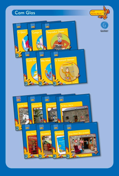 A pack of reading books comprising one copy of each title in the Pecyn Cam Glas of the Pobl Pentre Bach reading scheme.