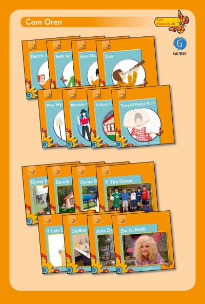 A pack of reading books comprising one copy of each title in the Pecyn Cam Oren of the Pobl Pentre Bach reading scheme.