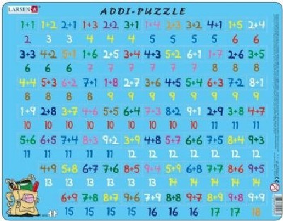 Learn Addition. There is one arithmetic problem on each piece. Solve the problem and place the piece by its correct answer. The piece will not fit if the answer is wrong. 81 piece jigsaw.