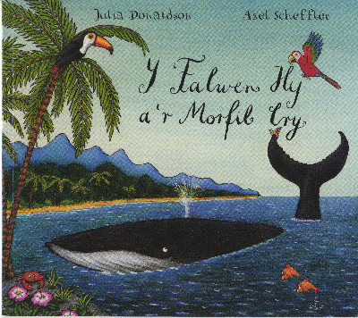 Breuddwydiai’r fôr-falwen drwy’r nos a drwy’r dydd Am grwydro y moroedd yn llawen a rhydd. Edrychodd i fyny, Edrychodd i lawr, Ochneidiodd a dweud, Mae’r môr mor fawr! Dyna braf fasai hi Cael crwydro ymhell dros donnau y lli!This is the tale of a tiny snail And a great big, grey-blue humpback whale. The snail lives on a rock in the dock. She longs to see the world, but how can she travel? By hitching a lift on the tail of a whale, of course!